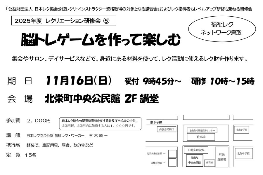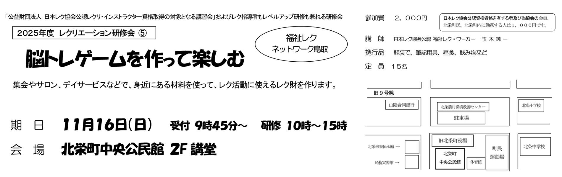レクリエーション指導者養成講座 2 2025年 6月 15日(土) 10:00 ~ 15:00 場所 : 北栄町中央公民館 2階 講堂 主催 : 福祉レク・ネットワーク鳥取 |