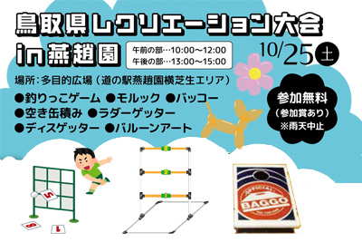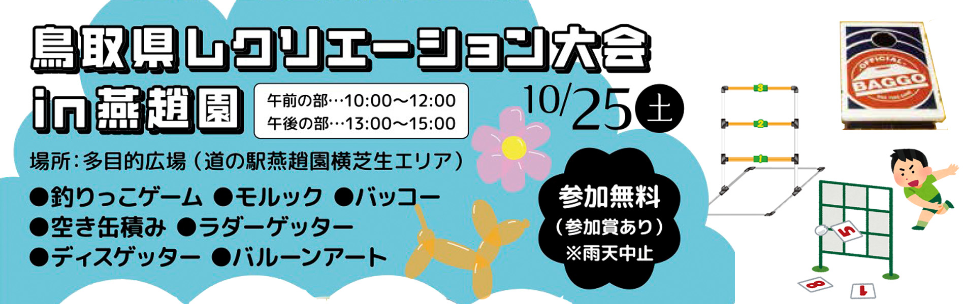 鳥取県レクリエーション大会 in 燕趙園 実施日時:2024年 11月 3日(日) 午前の部 10:00 ~ 12:00 午後の部 13:00 ~ 15:00 主催:第23回鳥取県レクリエーション大会実行委員会 |